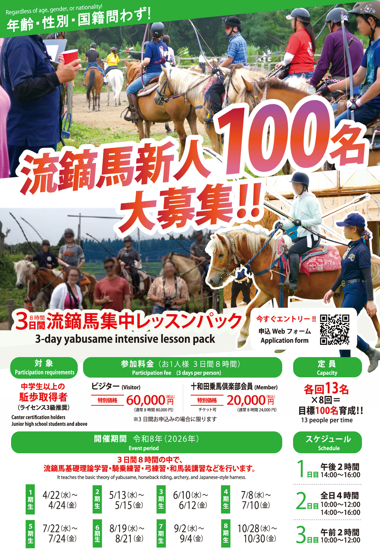 This is a three-day intensive program designed primarily for people who have horseback riding experience. It teaches the basic theory of yabusame, horseback riding, archery, and Japanese-style harness according to the skills of the participants.