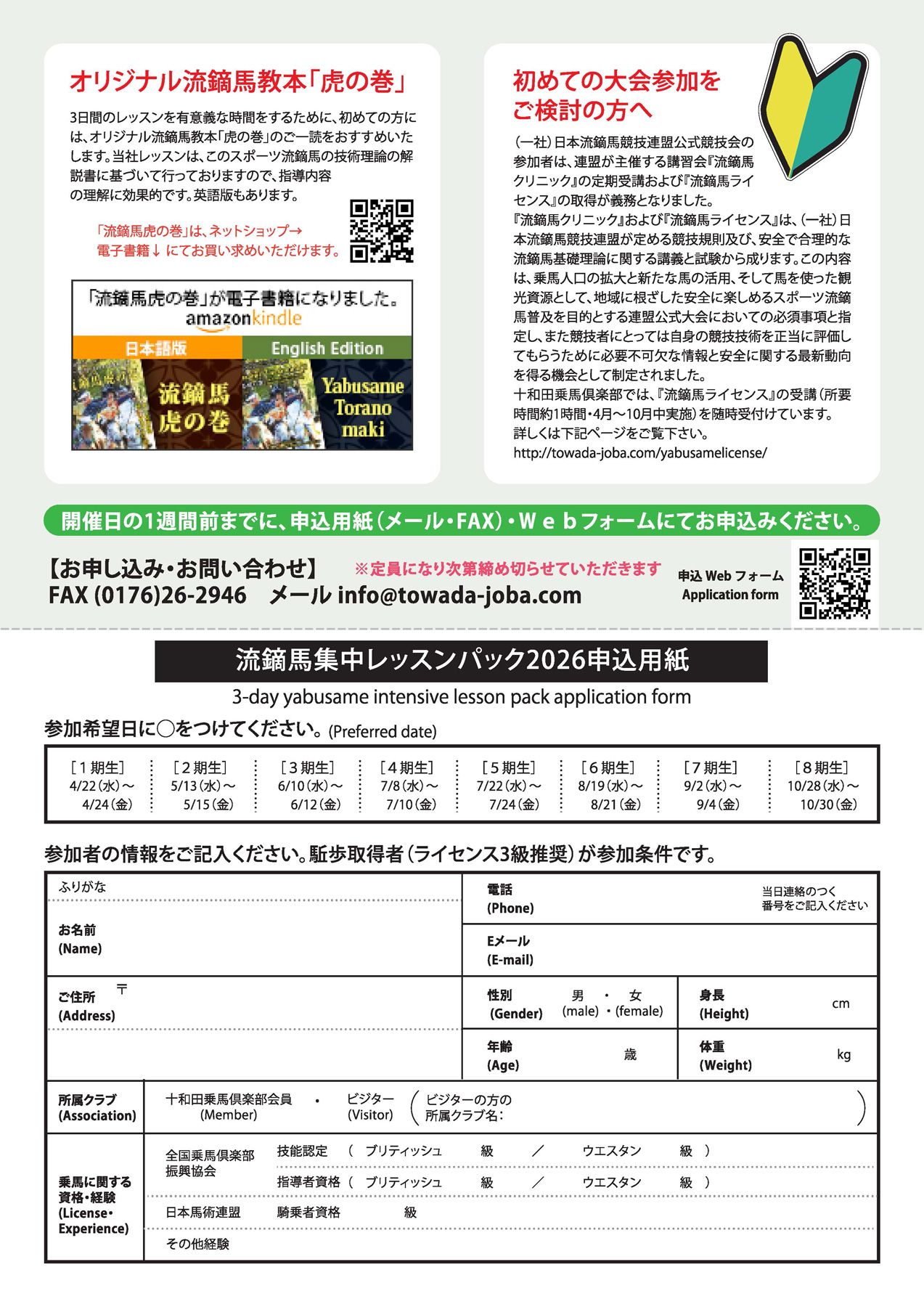 To make the most of your three-day lessons, we recommend that first-time participants read our original Yabusame instruction manual, “YABUSAME TORANOMAKI.” Our lessons are based on this commentary on the technical theory of sport Yabusame, so it is effective in helping you understand the instructional content. An English version is also available.